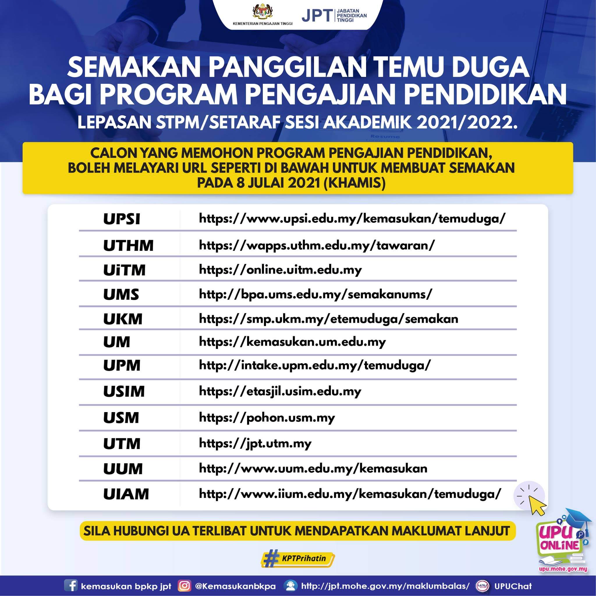 Please select your type of programme. Surat Tawaran Kemasukan Universiti 1 Salinan ii. Adalah dimaklumkan tarikh semakan panggilan temu duga bagi Program Ijazah Sarjana Muda boleh dibuat pada ketetapan berikut.